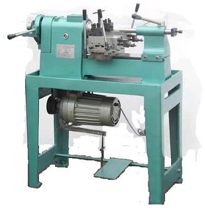 整體人性化設計,高度適合,啟動用腳踏來控制電機的離合器,腳踩下去電機帶動機床主軸旋轉,松開之后離合器斷開電機,剎車片馬上剎住機床主軸,馬上停車。桌上車床照片如下圖: